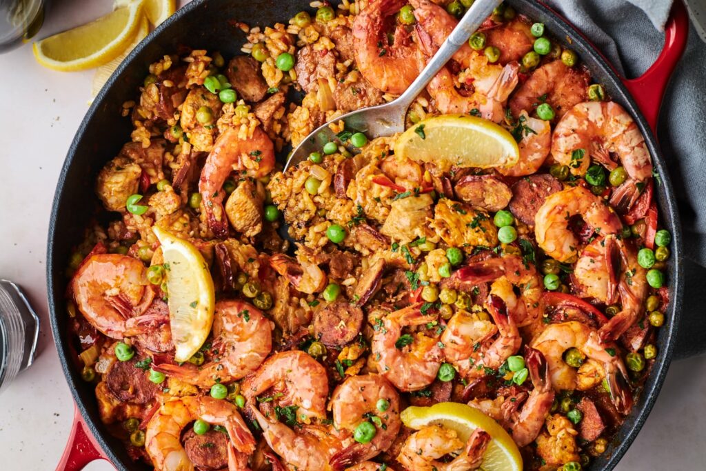 Paella Mixta, Chicken, Chorizo, Shrimp, Saffron, and Sofrito