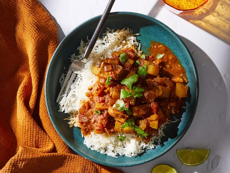 Entree: Chicken Vindaloo with rice pilaf and wilted spinach
