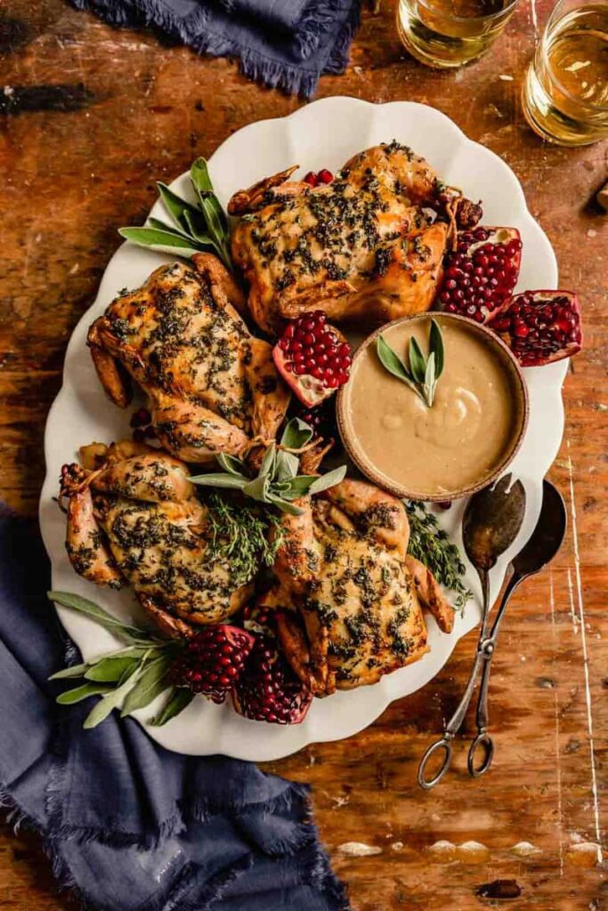 Cornish Hens with Cranberry and Wild Rice Stuffing | Served with whipped mashed potatoes and a rich bourbon gravy.