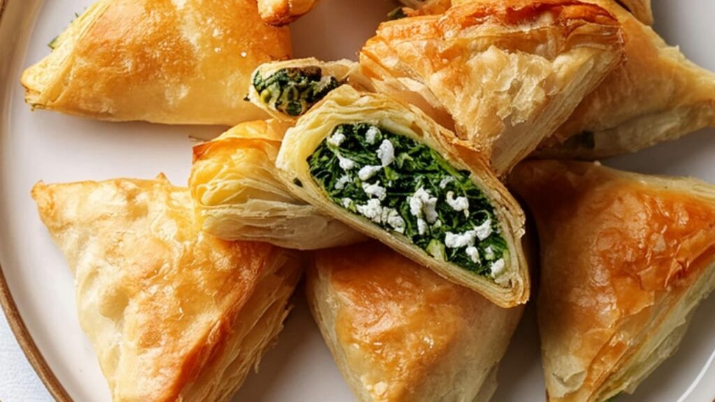 Greek Spanakopita Triangles | Flaky pastry stuffed with spinach, feta, and aromatic herbs.