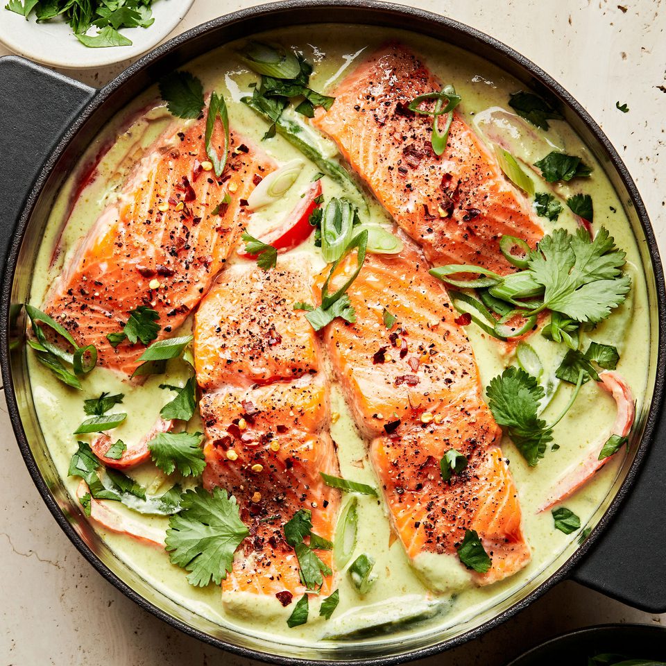 Poached Salmon with Green Curry Sauce and Coconut Rice