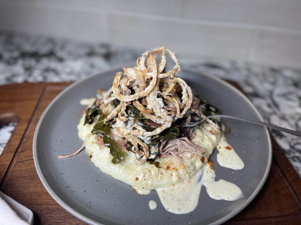 Pulled Pork with a traditional Carolina BBQ Sauce, Grits, and Braised Collard Greens