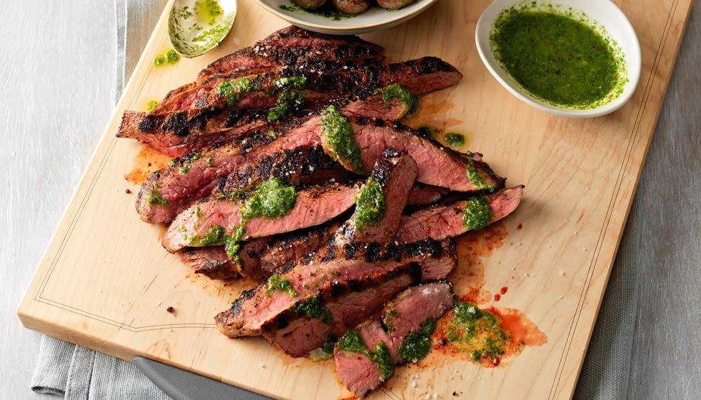 Entrée | Seared Steak with an Herb and Spice Steak Rub, Chimichurri, Fingerling Potato Hash