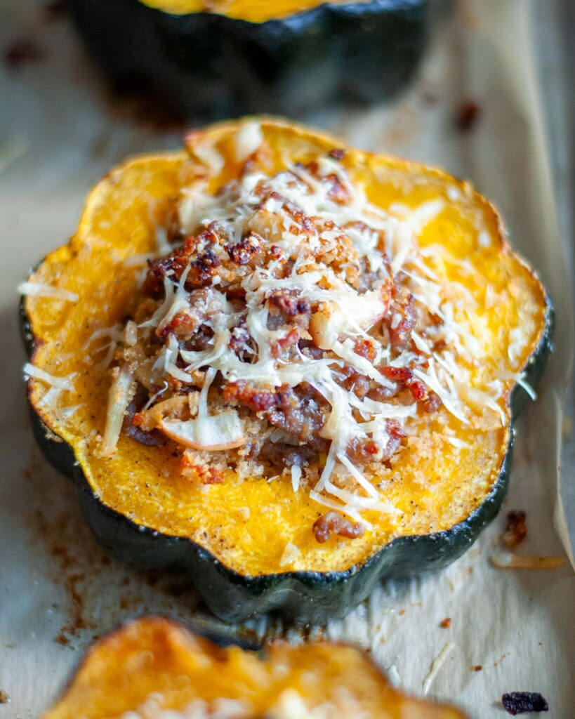 Sausage and Apple Stuffed Acorn Squash topped with Arugula Salad and Grilled Sourdough Ajoblanco