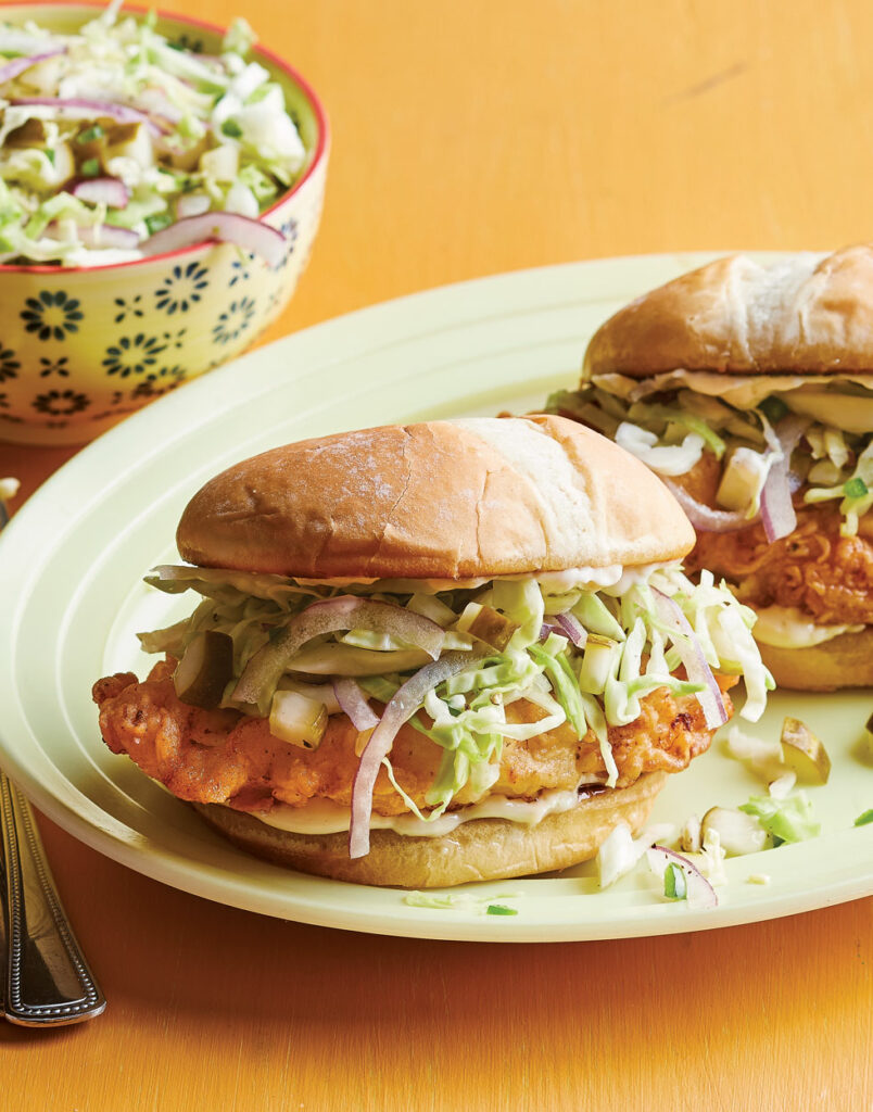 Dill Pickle Fried Chicken Sliders with Black Pepper Aioli and Pickle Slaw